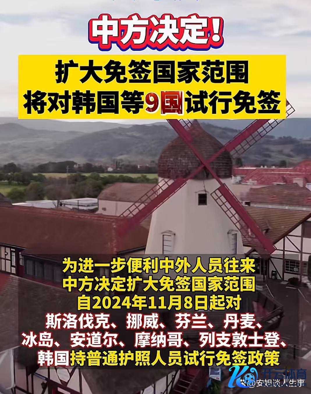 中国从2024年11月8日开动,对斯洛伐克、挪威、芬兰、丹麦、冰岛、安说念尔、摩纳哥、列支敦士登及韩国实行免签策略。这项策略不仅为九国旅客来中国铺平了说念路,还加快了文化与经济的有计划。