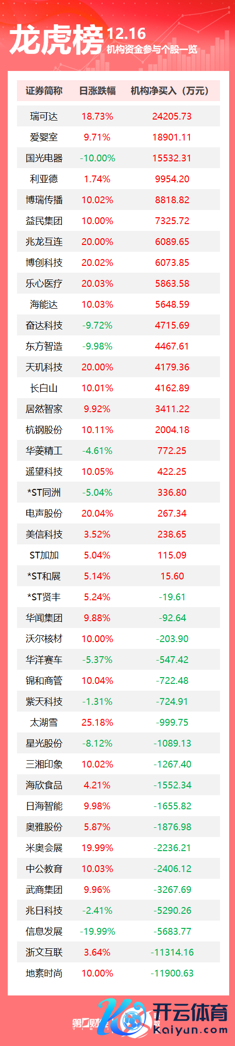 盘后数据走漏云开体育,12月16日龙虎榜中,共42只个股出现了机构的身影,23只股票呈现机构净买入,19只股票呈现机构净卖出。